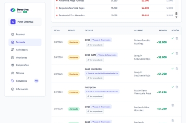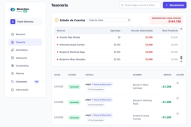 Los apoderados suben sus comprobantes. Tú solo validas con un clic. Todos ven el saldo general de la caja.