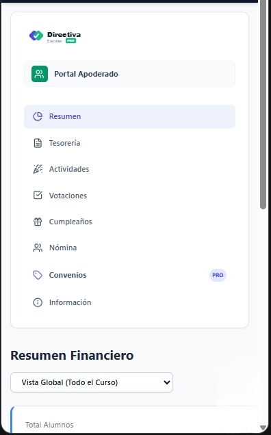 Diseño mobile-first. El apoderado sube comprobantes y vota desde el celular.